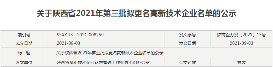 根据《高新技术企业认定管理办法》(国科发火〔2016〕32号)、、《高新技术企业认定管理工作指引》(国科发火〔2016〕195号)有关规定,,经企业申请,,,,省高新技术企业认定管理工作领导小组办公室审核,,,现将陕西省2021年第三批31家拟更名高新技术企业名单予以公示,,,公示期为10个工作日。。